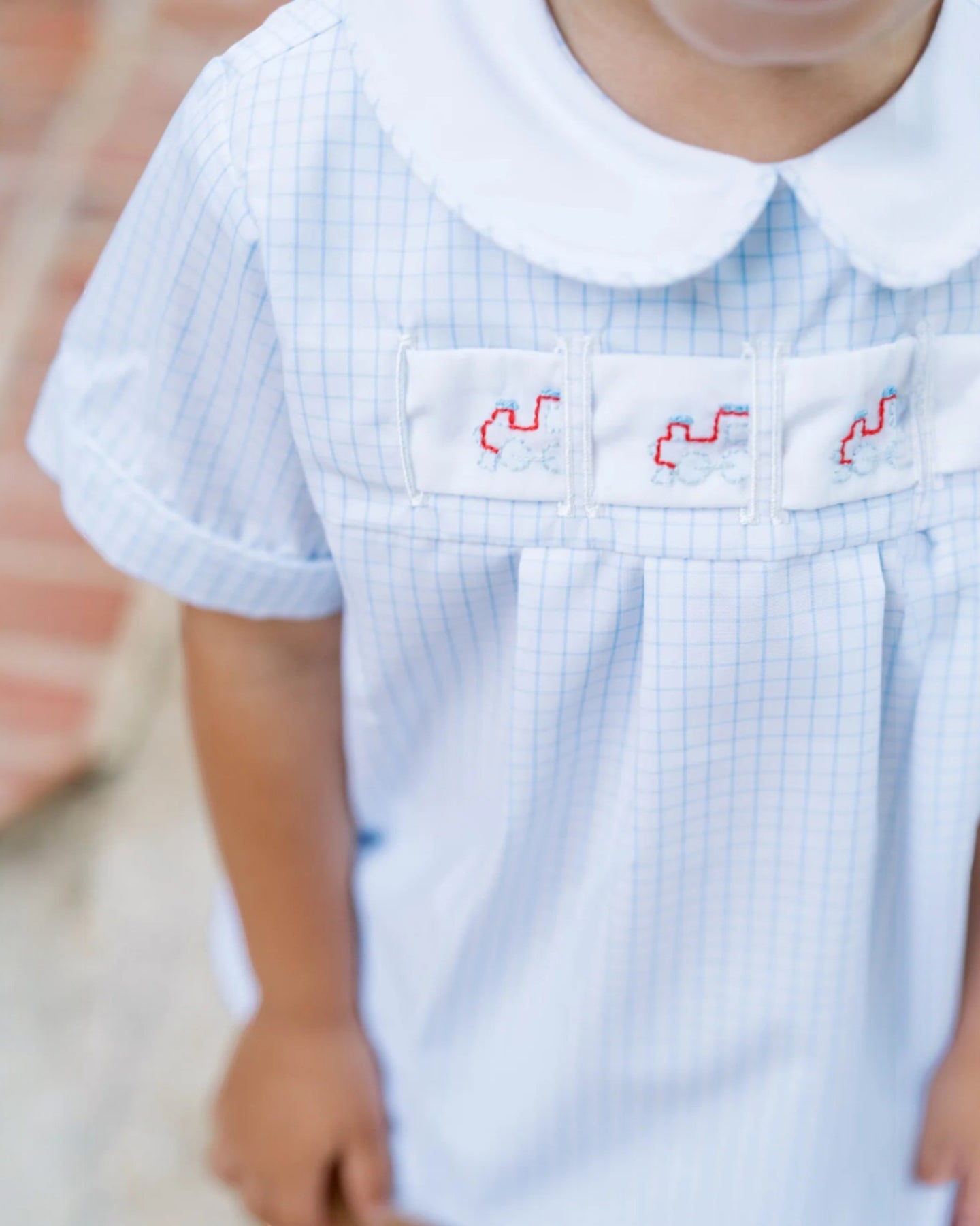 Timeless and charming, the Noah Bubble features a classic blue windowpane print enhanced with your choice of delicate train, bunny, or hearts ribbon embroidery across the check pattern. Perfect for Easter and all season long!