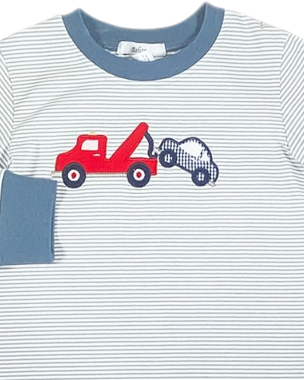 This Two Truck Applique Green Stripe Boys Pant Set is perfect for your little adventurer. Soft and comfortable, it features playful green stripes and a fun truck applique that adds a touch of charm. Ideal for active days, this set keeps your boy looking cute and feeling cozy from playtime to naptime.