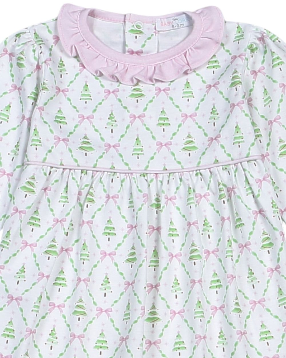 Dress your little one in festive fun with the Holy Night Pima Pink Girls Romper. Featuring an adorable Christmas tree and bow print, this romper brings holiday cheer in a soft, comfy design perfect for play and snuggles. Its bright pink hue adds a playful touch, making it the perfect outfit for joyful winter days and holiday celebrations.