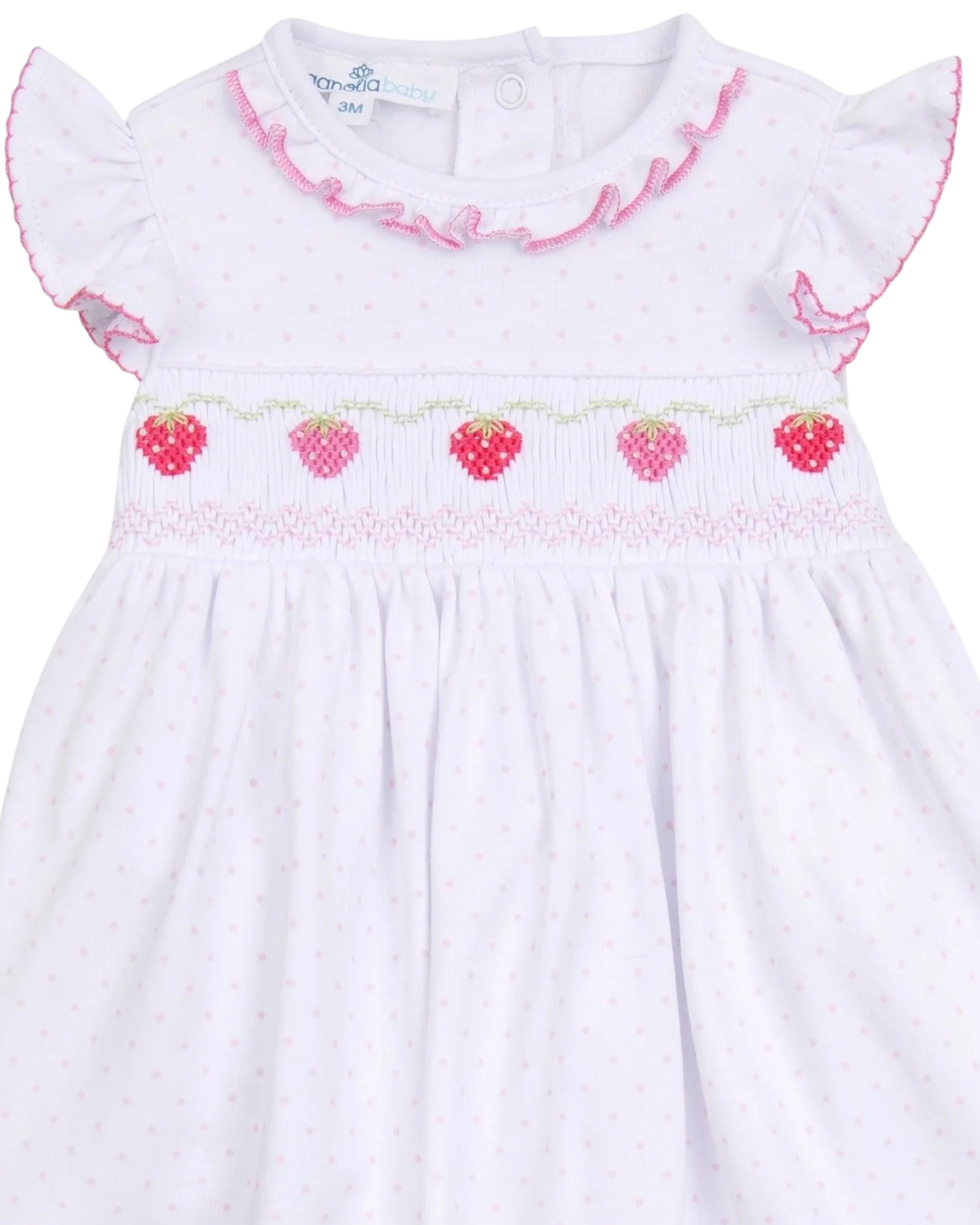 • Hand-Smocked Detail: Features sweet pink strawberries and white embroidery.