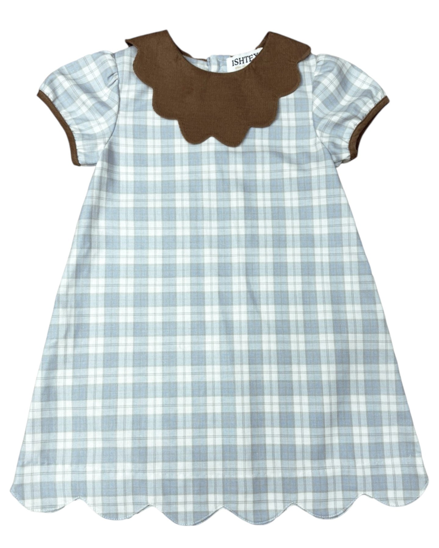 This Blue Plaid Scallop Dress is a darling choice for fall, featuring a sweet scalloped collar and hem that add a playful touch to the classic plaid design. Made with soft, comfortable fabric, it keeps your little girl cozy and stylish for crisp autumn days and fun seasonal outings.